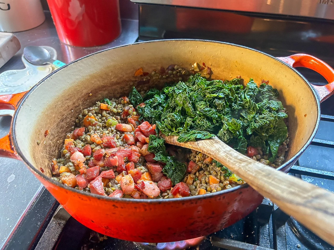 Add the pancetta and the kale and cook, stirring, for another 2 minutes. If the lentils are getting too brown, you can add some water at this point.