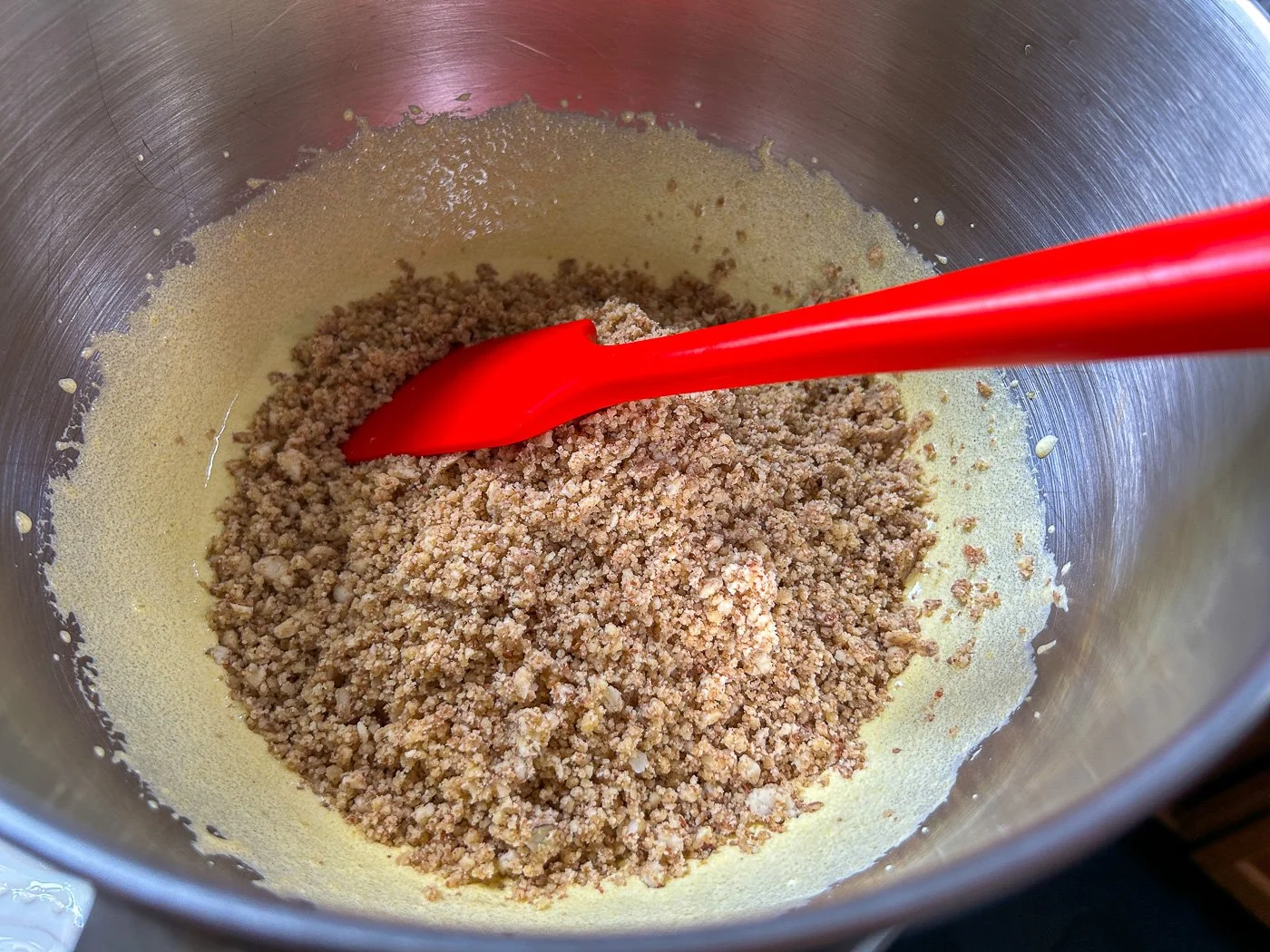 Either in a stand mixer or by hand, beat the egg yolks and sugar until pale and creamy (it should almost look like mayo). Add the lemon zest or whiskey and the walnut meal, stirring to combine.