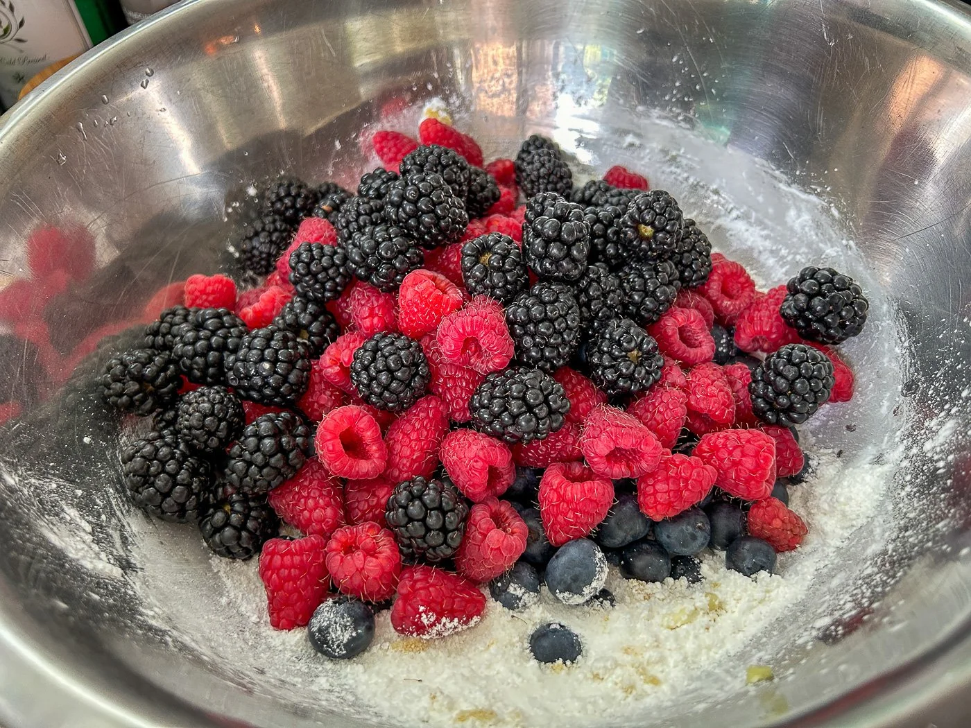 Well! That’s news I can use. So I moseyed on over there and bought several cartons of blueberries, blackberries, and raspberries and, because our friend Isaac was coming over for dinner, I decided to make a mixed berry pie.