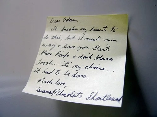 As mentioned in my Ferry Building post, the good people of La Cocina provided me with a package of Clare Squares (chocolate/caramel shortbread) to take back to New York. Strangely enough, though, as I packed up to leave Raife and Tohva's apartment I found a note stuck to my computer:Suspiciously, there were crumbs and an empty plastic package near the computer, but "blame the hosts" is not an exercise in which I'll take part.