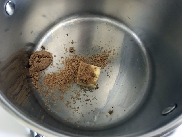 Here’s what I did (and there won’t be a printable recipe at the end, so pay attention!) (Are you mad?) In a pot, I added ONE TABLESPOON of butter and ONE TABLESPOON of brown sugar: