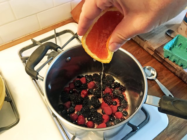 You could also add some booze here like Brandy, but that’d be a totally weird thing to do at 8:30 in the morning, so I’m not saying that I did it. But you could do it (just be sure to pour the brandy into a little measuring spoon first so you don’t pour directly from the bottle over the open flame, or you really will be berry-blasted):
