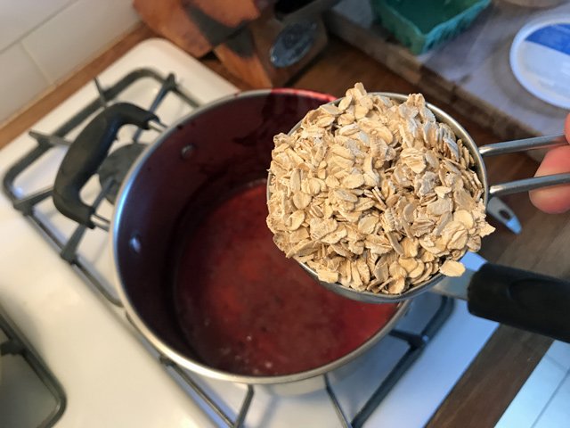 Bring that to a boil with a pinch of salt and then add half a cup of old-fashioned oats (this serves one, btw):