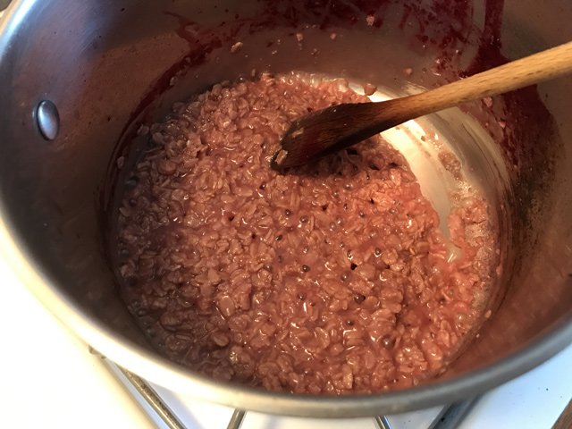 Stir that in, lower the heat a bit, and cook until your oatmeal’s thick and there’s almost no liquid left. It’ll be a cool pink color:
