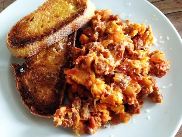 Scrambled Eggs with Sausage, Tomatoes, & Pecorino