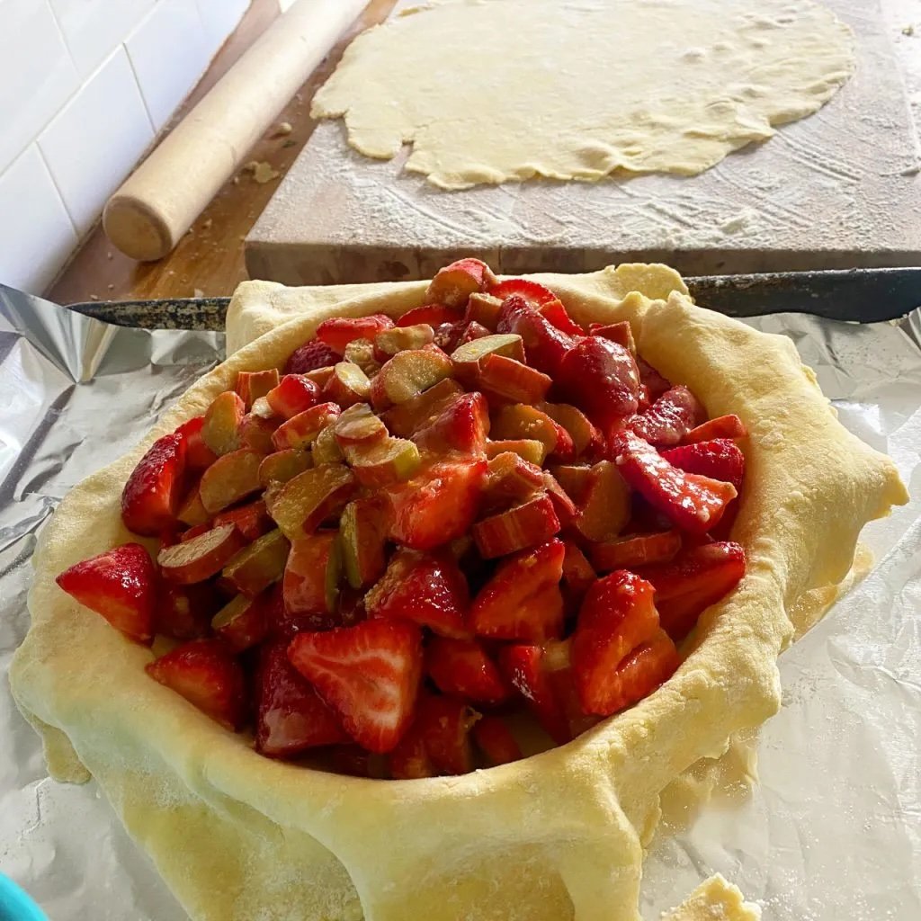 Heat the oven to 425 and make your filling. In a large bowl, combine the rhubarb, strawberries, sugar, brown sugar, corn starch, lemon zest, vanilla, and salt.