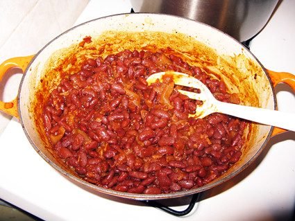 To make these beans, you have to start with dry beans. Because they cook for six hours, canned beans will probably fall apart. So if you are a responsible person, you will, the night before, take one pound of dry red kidney beans and soak them in cold water (cover by one inch) in the refrigerator. The next day you will drain them and rinse them.