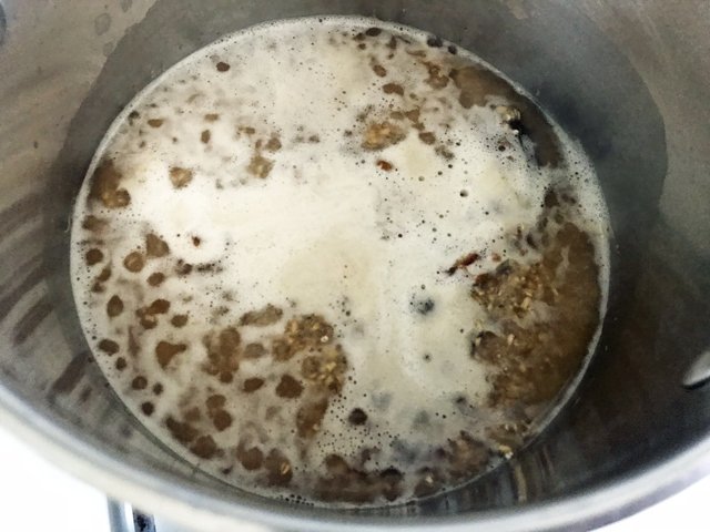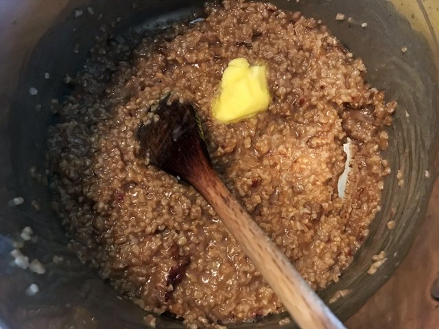 Lower the heat and continue to simmer for 20 minutes or so. If the pan dries up before the 20 minutes are over, add another 1/2 cup of water, and continue to stir periodically. Here’s the cool thing that’ll happen: the dates will break apart. Towards the end, you’ll want to beat everything vigorously and really work those dates into the oatmeal. And then, if you’re feeling naughty, you can add a fourth ingredient: a little nub of good butter (I’ve been using Beurre de Baratte lately).